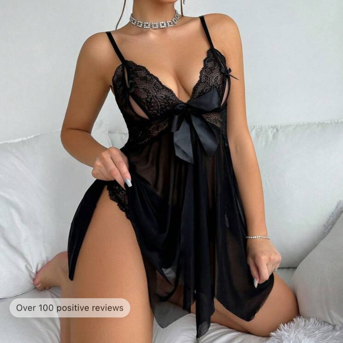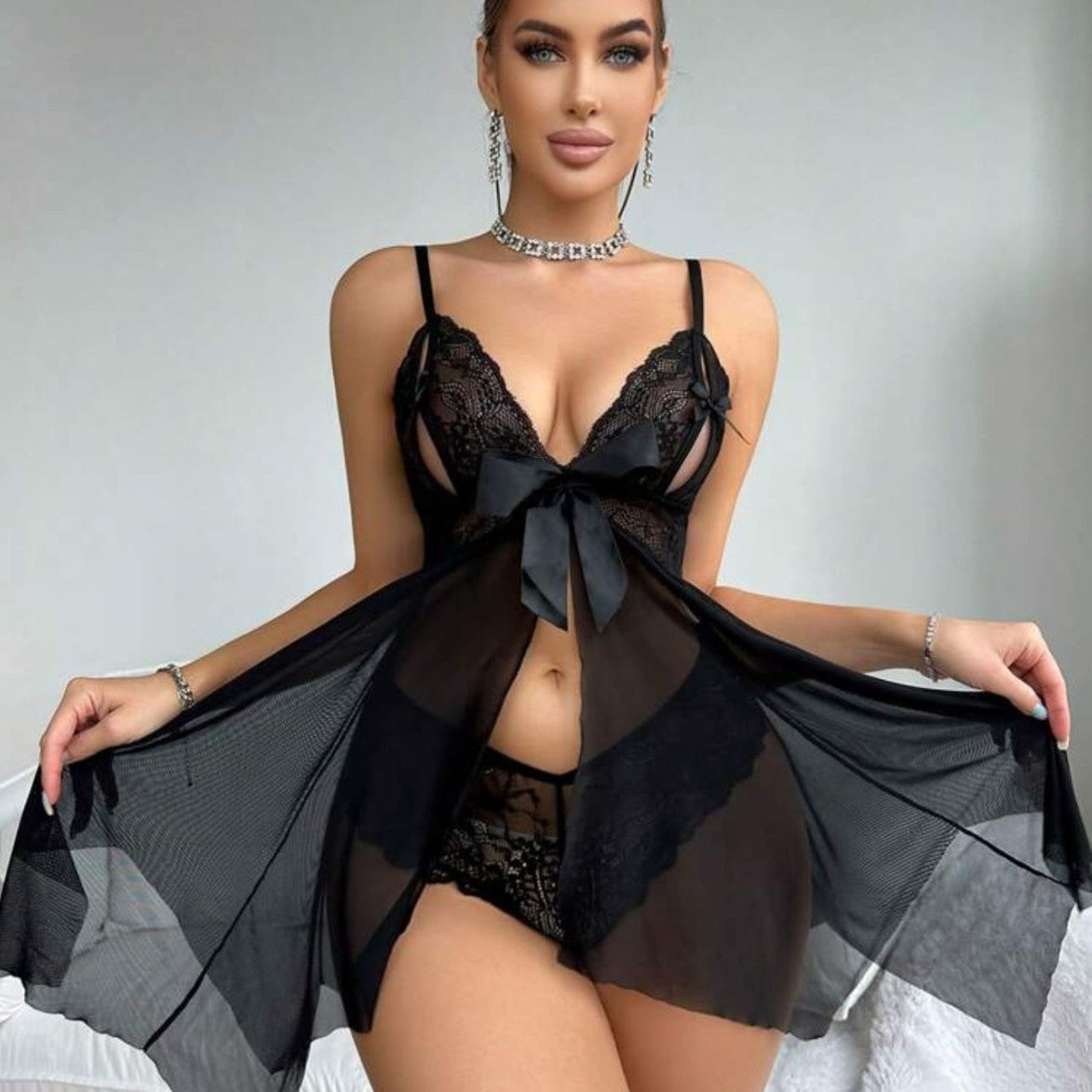 Satin Bow Sheer Babydoll Set with Lace Cup Detail